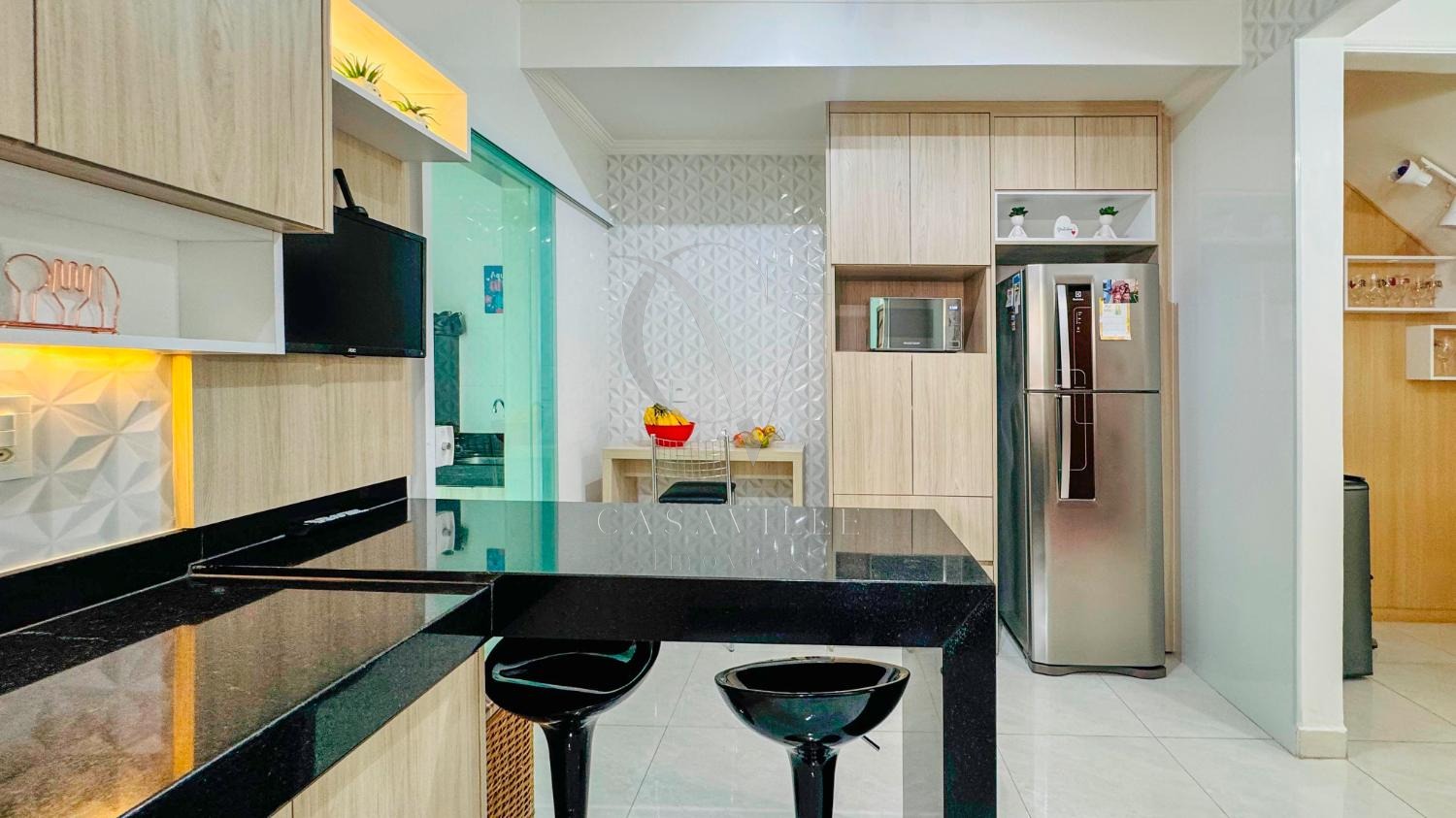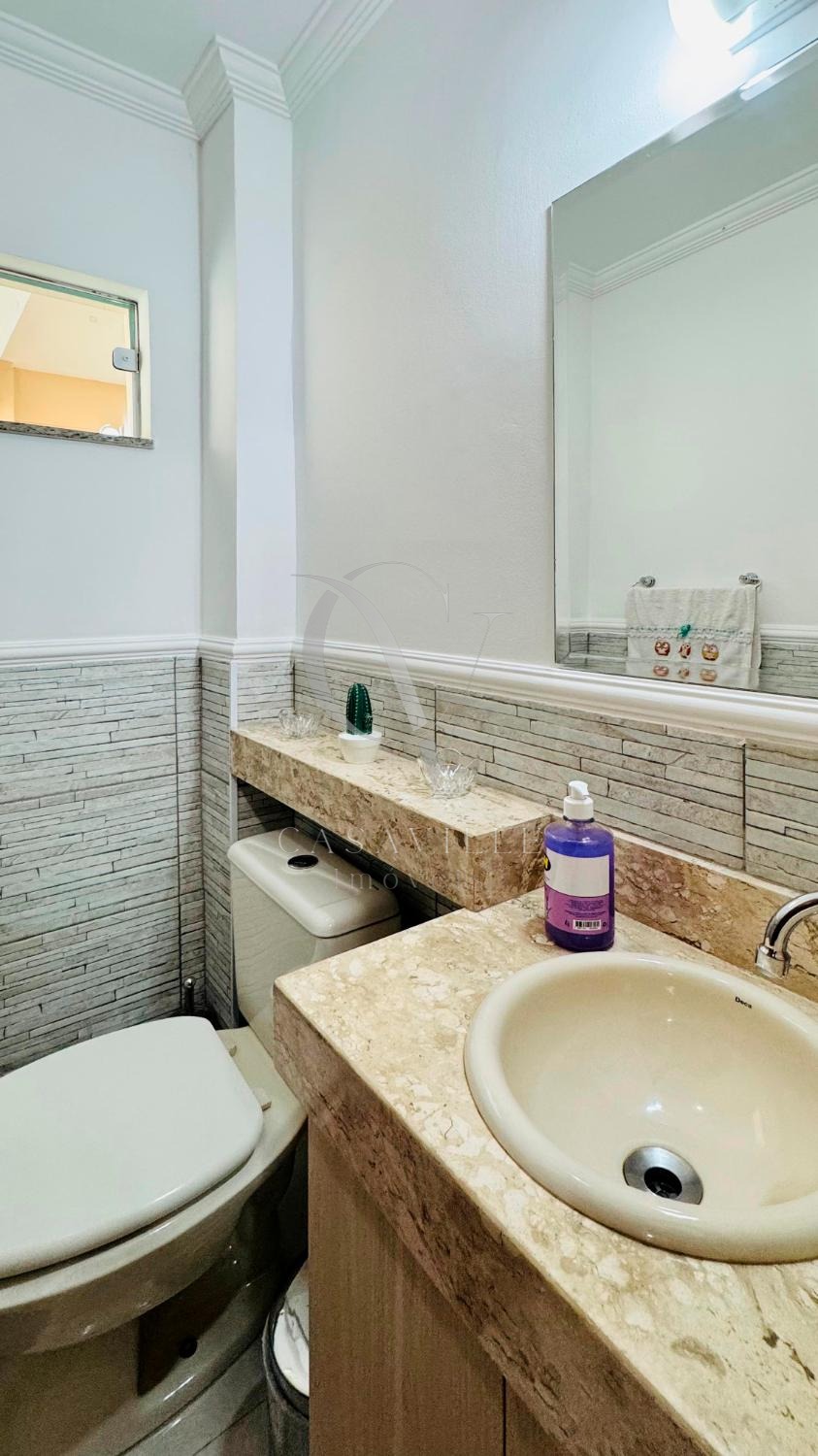 No térreo, a sala de estar e jantar integradas criam um ambiente amplo e convidativo, ideal para momentos de convivência. Um charmoso barzinho adiciona um toque especial, perfeito para reunir amigos e familiares. O piso conta ainda com um lavabo, garantindo praticidade. A cozinha, recém-reformada, possui móveis planejados modernos e funcionais, proporcionando um espaço ideal para suas refeições. Além disso, a área de churrasco é um convite para os momentos de lazer.